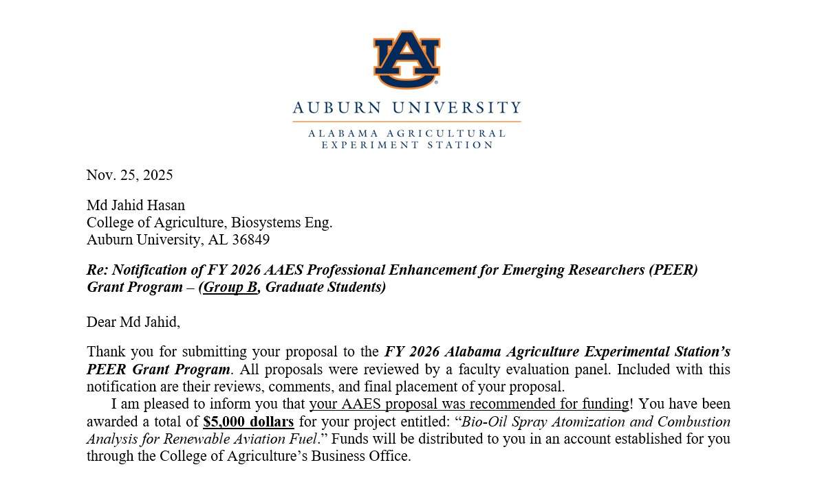 I am honored to receive the Alabama Agricultural Experiment Station (AAES) Professional Enhancement for Emerging Researchers (PEER) Grant under Group B (Graduate Students) for FY 2026. This competitive award provides $5,000 in funding to support my research project titled “Bio-Oil Spray Atomization and Combustion Analysis for Renewable Aviation Fuel.” The project aims to advance sustainable aviation fuel technologies through detailed spray and combustion analysis.